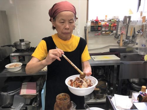 大きな丼にほかほかのご飯と焼いた鶏肉。その上に、瓶に入った秘伝のたれを、お母さんがまわしかけてくれます。また、こちらの丼にはレモン果汁と唐辛子がついてくるので、途中で味を変えて楽しむことができます。
