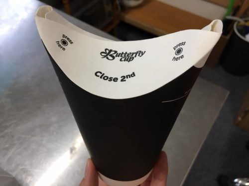 プラスチック削減のため、ドリンクを提供するカップとしてお店で使われているのが、こちらのバタフライカップ。紙でできていて、フタを折りたたむと、両側に飲み口ができる仕組みになっています。まだ熊本にも入ってきたばかりという、新しい形のカップです。