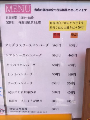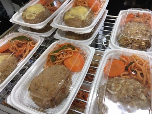 テイクアウトのメインはハンバーグで、チーズハンバーグやキャベツハンバーグなどがたくさん並んでいます。注文を受けてから、ソースをかけるそうです。