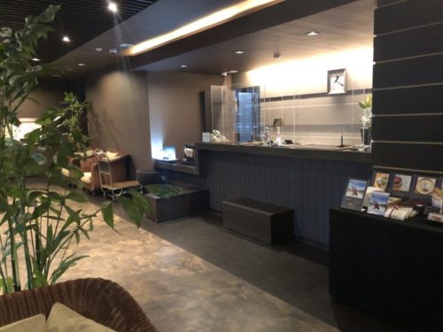 自動ドアを進むと宿泊施設のフロントあり、奥のエレベーター近くに湯屋水禅のフロントが設置されています。