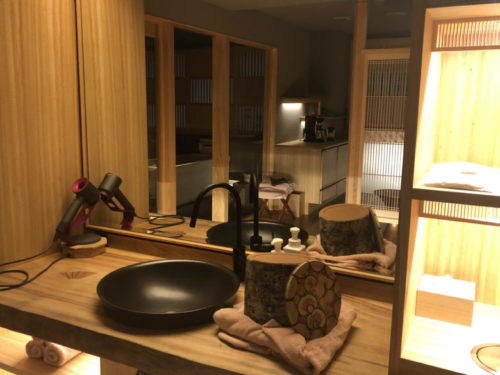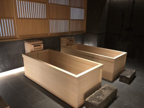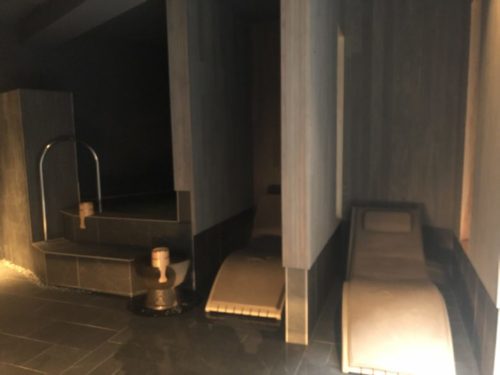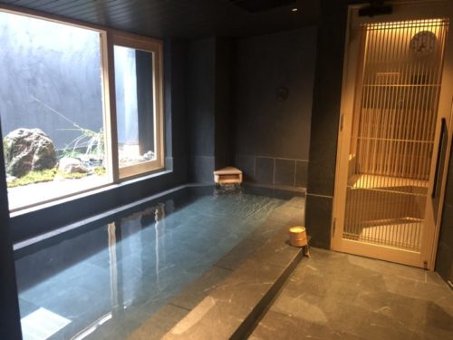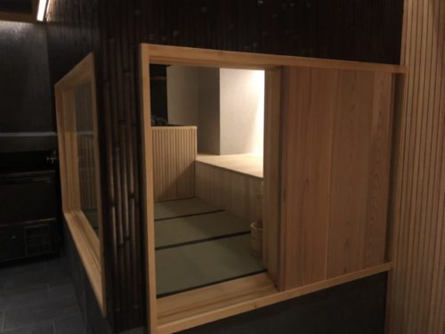 浴室には水風呂とお湯の両方が張れるように2つの浴槽が用意されています。サウナは!?というと、浴槽の隣には茶室のような畳張りの小さなお部屋が!!