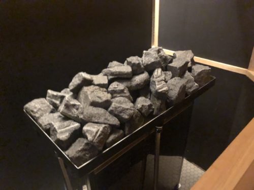 ヒノキの香りが漂うサウナ。真ん中にはアツアツに熱された阿蘇の溶岩が設置されていて、セルフロウリュウが可能です。