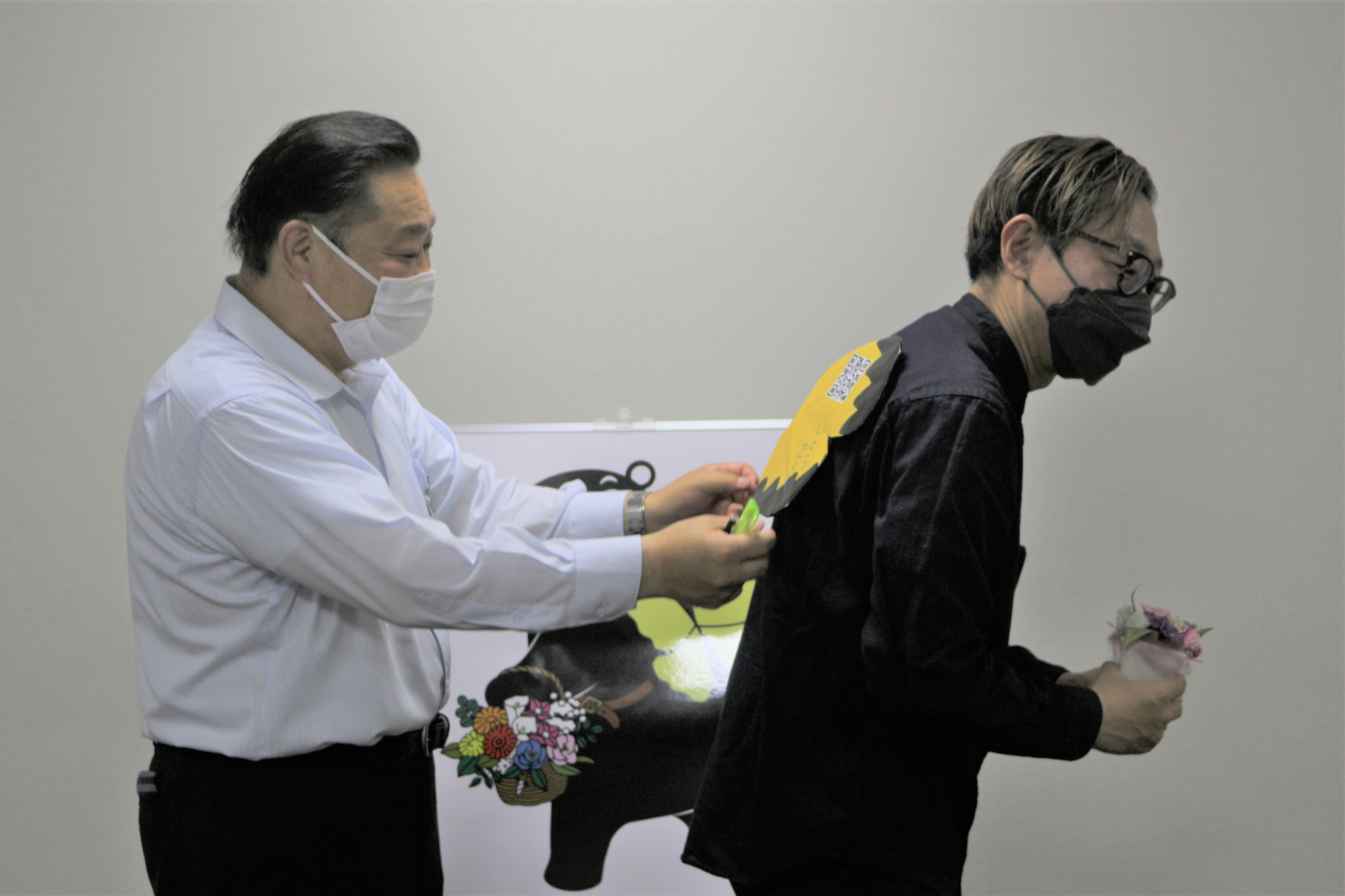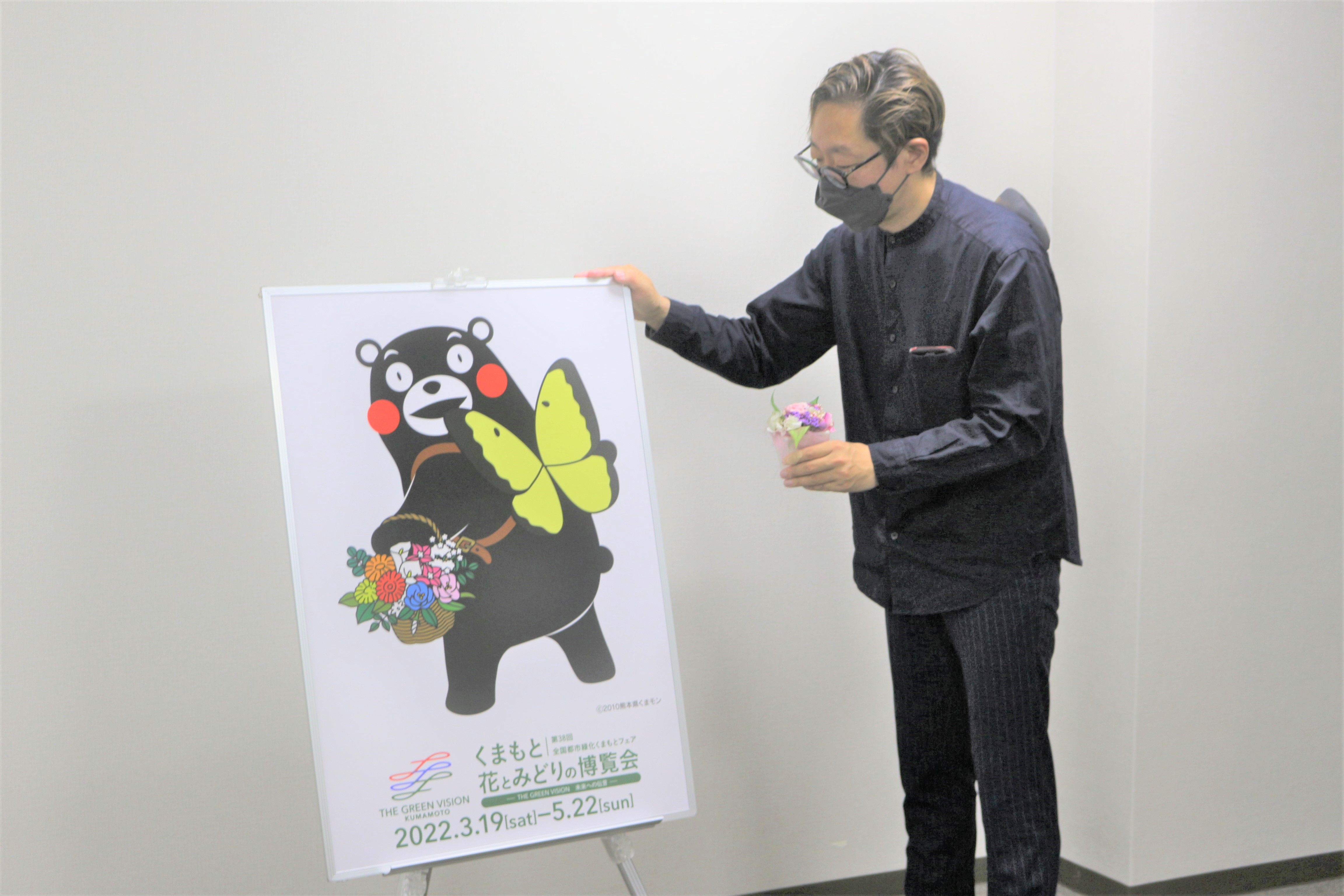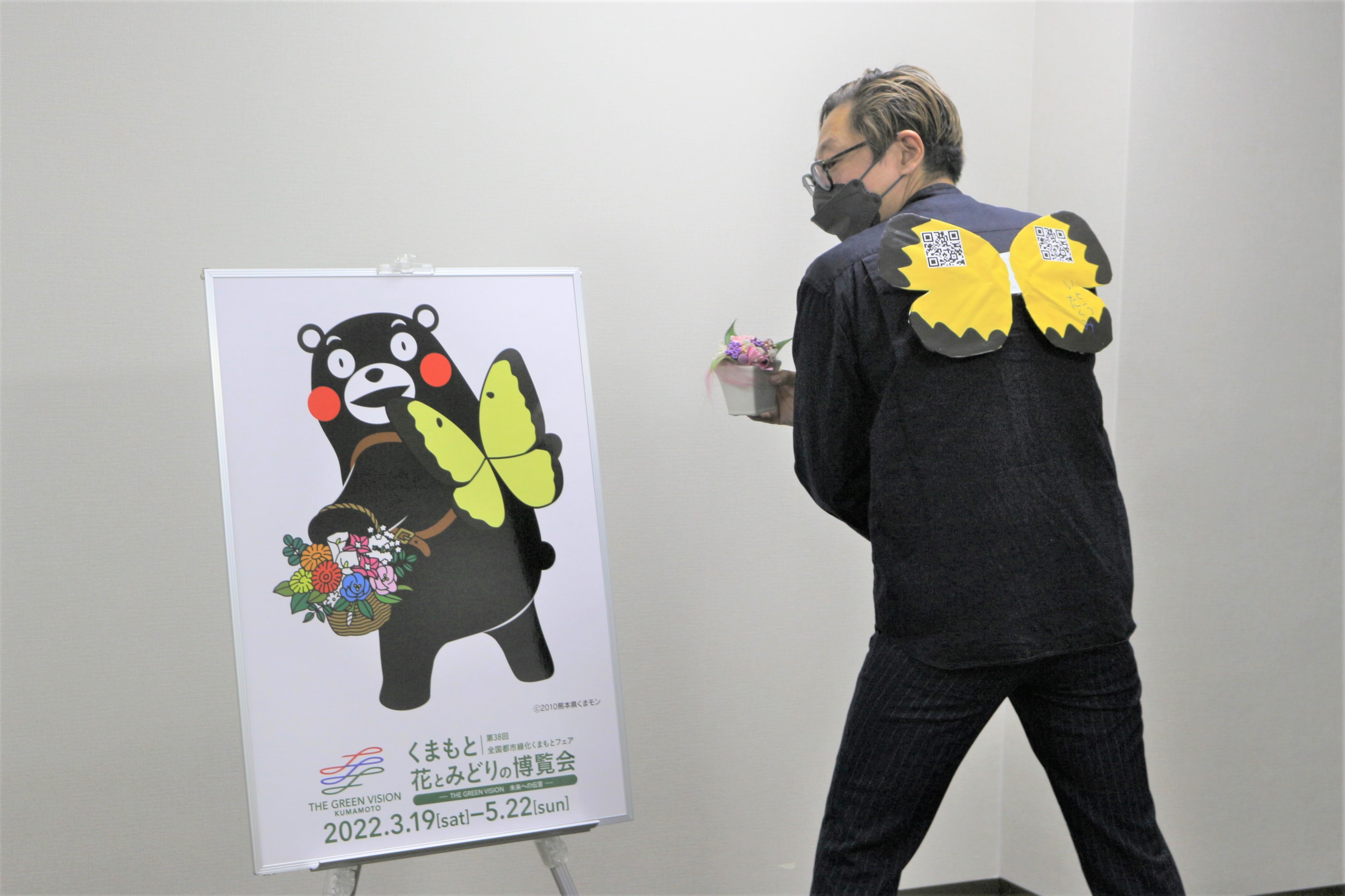『たくさんのお花が咲き誇る会場で、蝶に扮したくまモンが飛び回り、集めたお花とともに笑顔と幸せをみんなに届けられるように』という想いが込められているそうです。