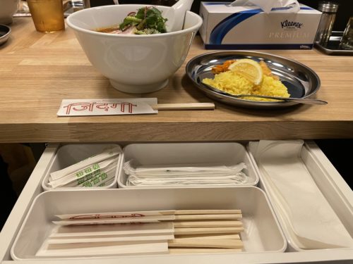 と、その前にお箸と紙エプロン…あれ?ないよ…と思ったら机の下に引き出しが