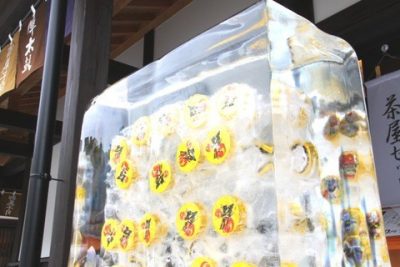 夏の陣太鼓の風物詩といえば、この「陣太鼓氷柱」! 子供達が集まって、一生懸命なんとか氷を溶かしながら氷の中の陣太鼓を獲得しようとする姿は、よくメディアなどでも取り上げられていますね。