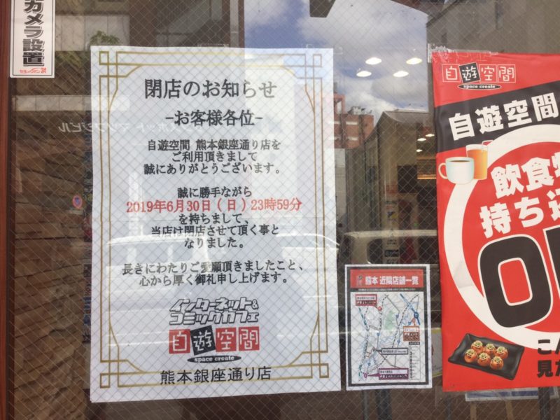 銀座通りにあるインターネットカフェ「自遊空間 熊本銀座通り店」が6月30日(日)をもって閉店するそうです。