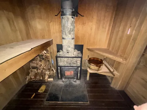 It’s equipped with a Finnish-style wood stove, and the tools for adjusting the heat, including gloves, are at your disposal.