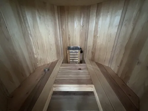 Inside, the layout resembles an H, with wooden dividers between the seating. This thoughtful design allows you to relax in the sauna while comfortably stretching your legs, keeping a safe distance from the stove without being too far away!