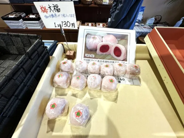 梅大福:將整顆蜜漬梅子(含籽)包裹在軟糯的大福中,價格130日圓。